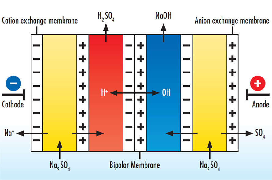 雙極膜技術的簡單的實施方案是所謂的3室堆疊—雙極膜電滲析。在這種情況下,堆疊中的重復膜單元由雙極膜,陽離子和陰離子交換膜組成。在電場中,陰離子通過陰離子交換膜遷移到陽極,保留陽離子在雙極性膜的一側,并最終與雙極性膜中產生的質子一起形成酸。以相同的方式,在雙極性膜的另一側上形成堿溶液,并在中央粗溶液室中形成稀釋液。