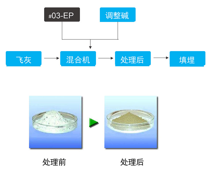 為了應(yīng)對(duì)這樣的飛灰處理,我們開發(fā)了可以作為重金屬的固定處理劑的“NEP# 03 - EP”產(chǎn)品,運(yùn)用到成本較低的液體螯合法,對(duì)飛灰少量添加,可與有害重金屬(Pb、Cd、Hg等)形成牢固結(jié)合,進(jìn)行有效固定化,防止浸出。