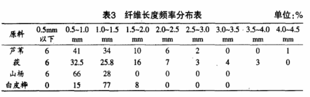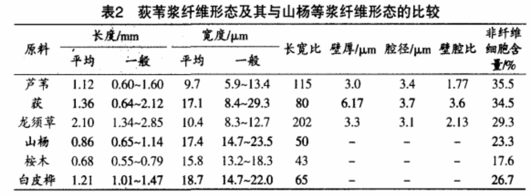 (1)纖維長度:蘆葦漿和荻漿纖維長度并不比闊葉木漿的短,尤其是荻漿纖維長度遠遠大于桉木和楊木等闊葉木
